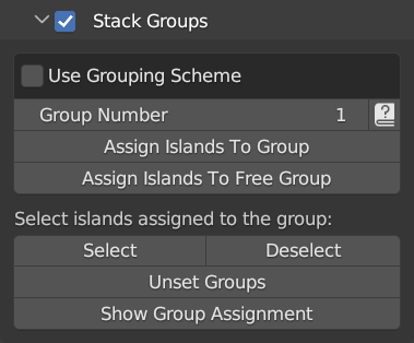 When a scheme is used the define stack groups, islands assigned to the same, non-default group, will be automatically stacked before packing but only if they pass the similarity test between each other. So using stack groups is logically equivalent to running the Align Similar (Stack) operator separately for every stack group and then running a packing operation on the results. The similarity test is driven by the standard similarity options from the Aligning multi panel.