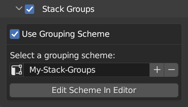 In order to define stack groups using a grouping scheme, create a new scheme for that purpose or select an already existing scheme. After the scheme is selected, press the Edit Scheme In Editor button - you will be automatically redirected to the Grouping Editor with the given scheme selected for editing.