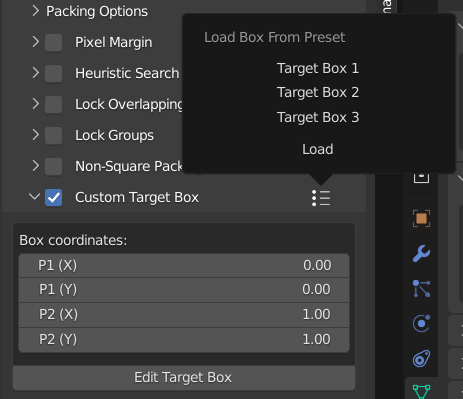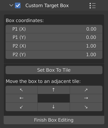 You can specify the box coordinates manually in the subpanel, you can also press the Edit Target Box button in order to enter the Box Edit mode. In the Box Edit mode the add-on renders the box in the UV space so you can modify it with visual feedback.