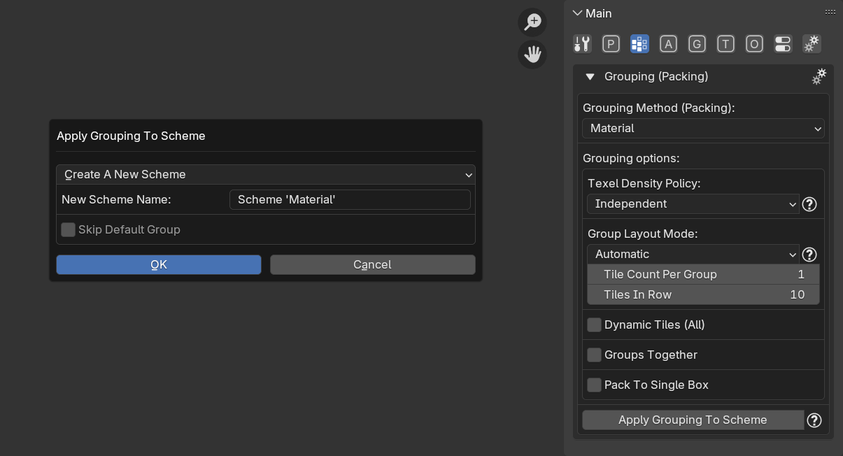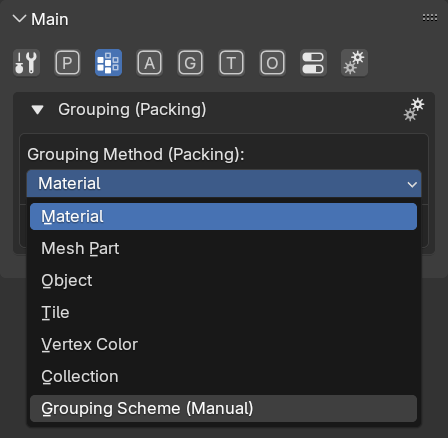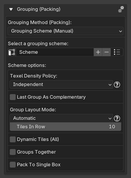 When using the Grouping Scheme (Manual) method, you have the most control over the packing process, but you also have to create groups and assign islands to them manually. You can now speed up the process of group creation and assignment by using an automatic grouping method as a base for scheme generation. For the record: the automatic grouping methods are the first 6 grouping methods from the menu: Material, Mesh Part, Object, Tile, Vertex Color, Collection.