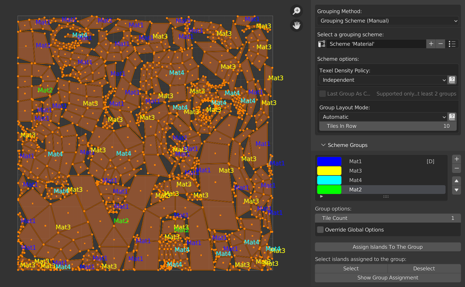 After the operation is done, you will see the generated scheme will be selected in the addon UI, containing the groups corresponding to items of the given automatic grouping method. The UV islands will be assigned to the corresponding groups. An exemplary view after scheme generation (using the Material method):