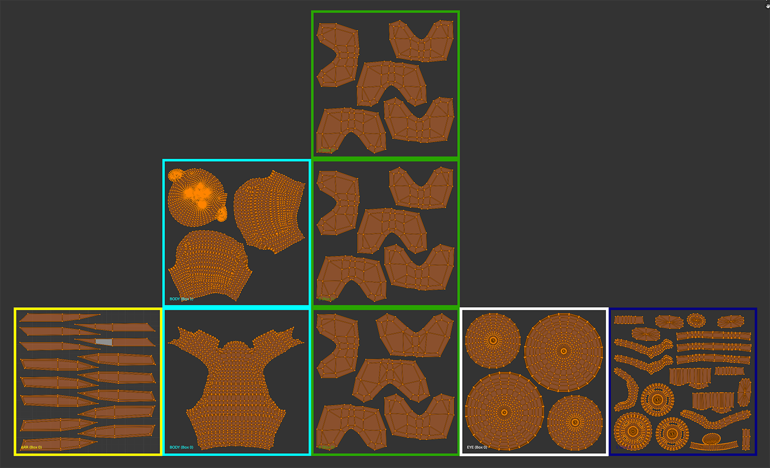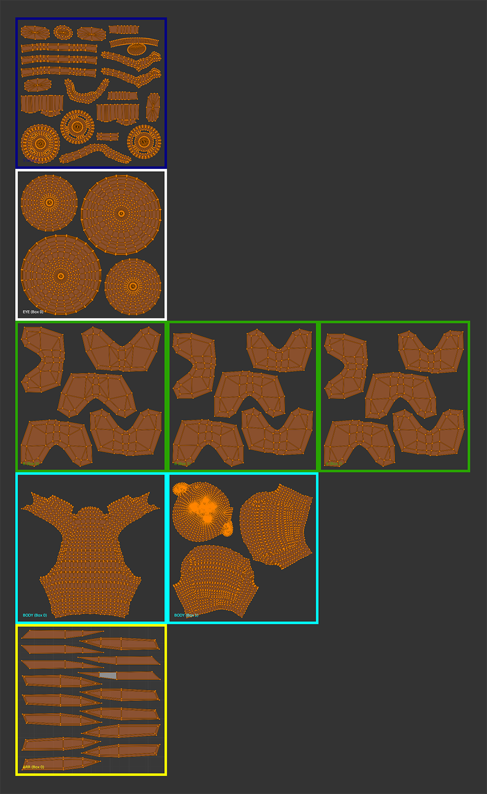 When you press the Edit Scheme Target Boxes button, the addon will enter the Box Edit mode - it will render all target boxes of all groups directly in the UV editor. You can then modify the boxes with visual feedback. An exemplary Box Edit mode view: