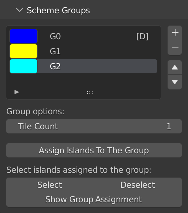 A newly created scheme will only contain a single default group G0 (all islands in the UV map will belong to this group by default). In the Scheme Groups subpanel you can: